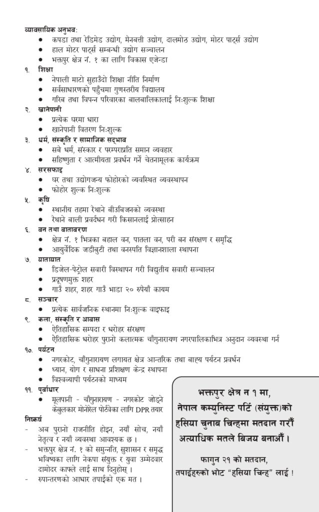 भक्तपुर । आगामी प्रतिनिधिसभा सदस्य निर्वाचनलाई लक्षित गर्दै नेपाल कम्युनिस्ट पार्टी (संयुक्त) का भक्तपुर क्षेत्र नं. १ का उम्मेदवार दामोदर काफ्ले ले आफ्नो चुनावी घोषणापत्र सार्वजनिक गरेका छन्।