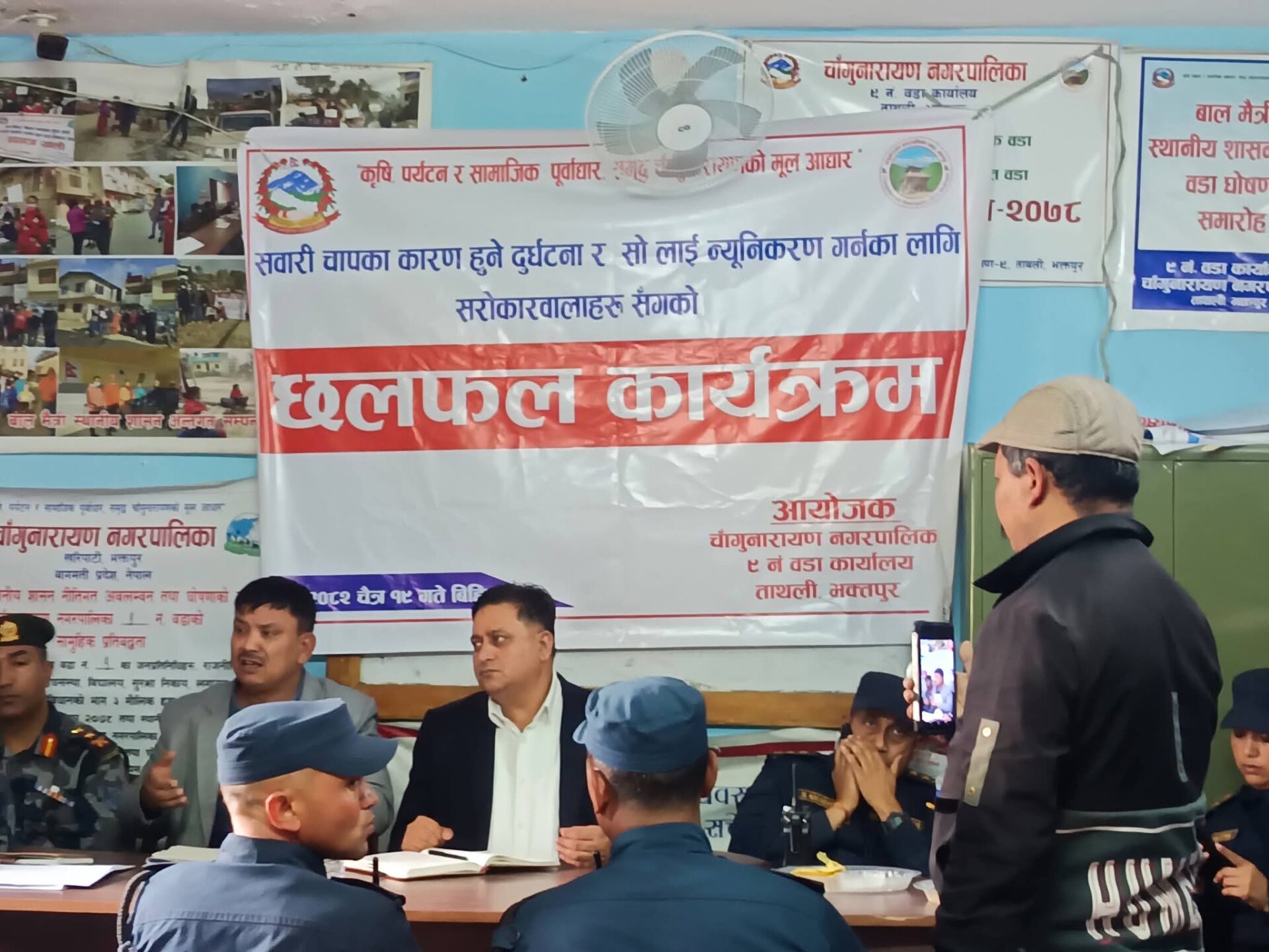 भक्तपुर, चैत, १९ । ताथली–नाला सडकखण्डमा बढ्दो सवारी चापका कारण दुर्घटनाको जोखिम बढ्दै गएपछि त्यसलाई न्यूनीकरण गर्ने उद्देश्यले सरोकारवालाबीच विस्तृत छलफल सम्पन्न भएको छ। चाँगुनारायण नगरपालिका वडा नं. ९ को आयोजनामा सम्पन्न उक्त कार्यक्रममा जनप्रतिनिधि, सुरक्षा निकाय, व्यवसायी, विभिन्न समाजका प्रतिनिधि तथा युवाहरूको उल्लेख्य सहभागिता रहेको थियो।
