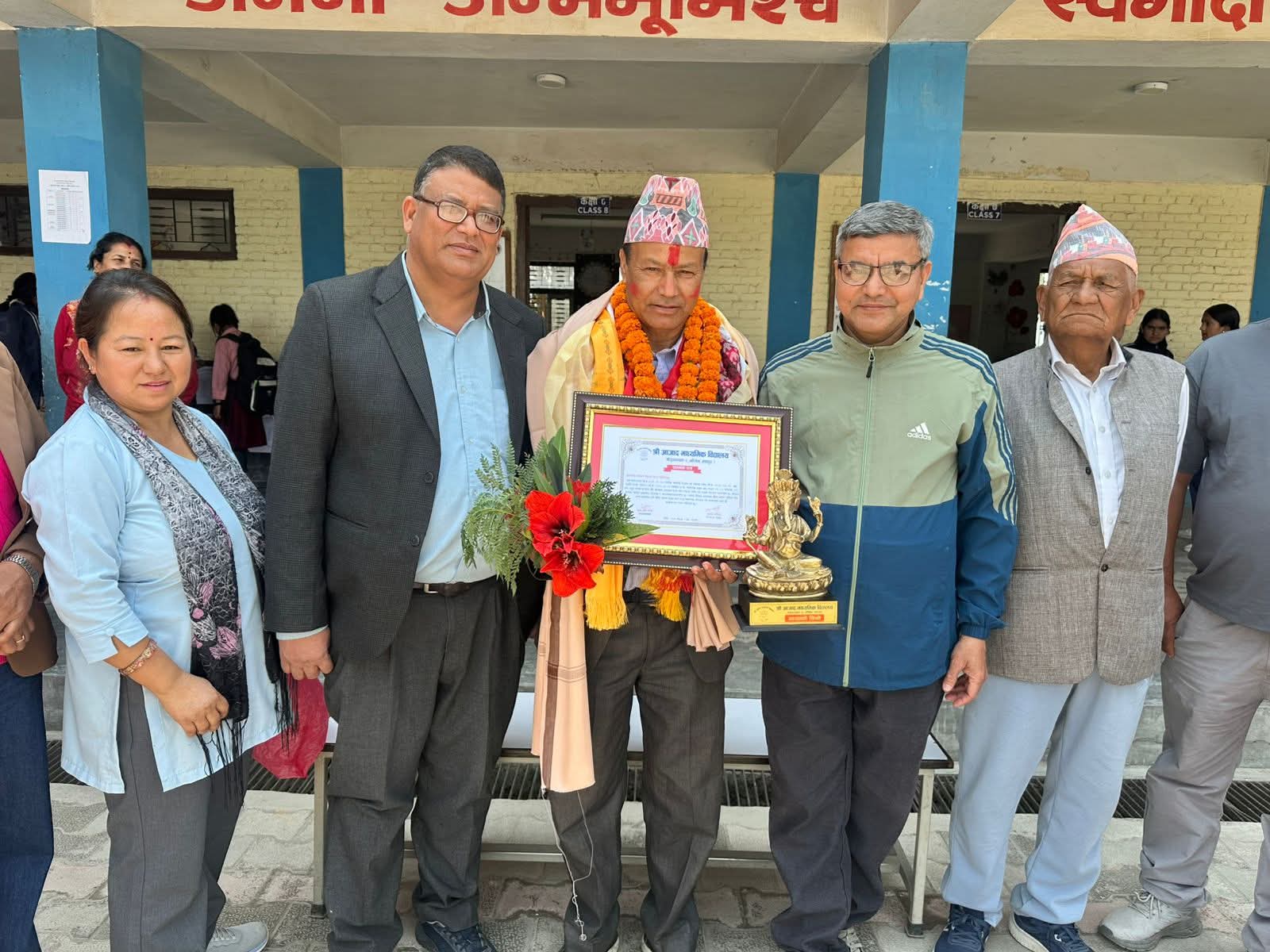 विद्यालय परिवारले बाजागाजा, फूलमाला, दोसल्ला र सम्मानपत्रसहित उहाँलाई भावपूर्ण विदाइ दियो। विद्यार्थीहरूले प्रस्तुत गरेका साना सांस्कृतिक कार्यक्रम र सम्झनाका क्षणहरूले सम्पूर्ण वातावरणलाई अझ आत्मीय बनाएको थियो।